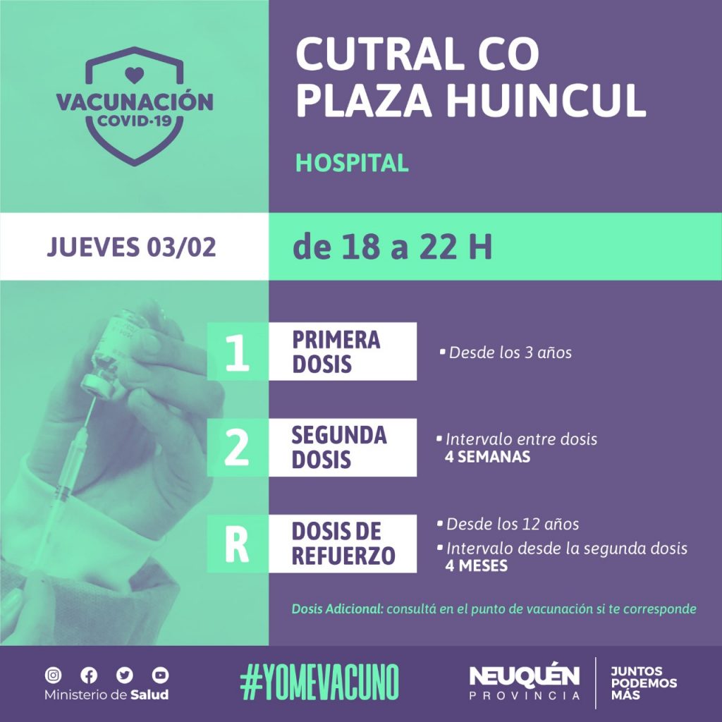 La jornada del jueves 3 de febrero será con horario completo de vacunación contra el COVID-19. Desde el hospital se informó que se inicia a las 8 en los centros de salud y se termina a las 22 en el hospital.