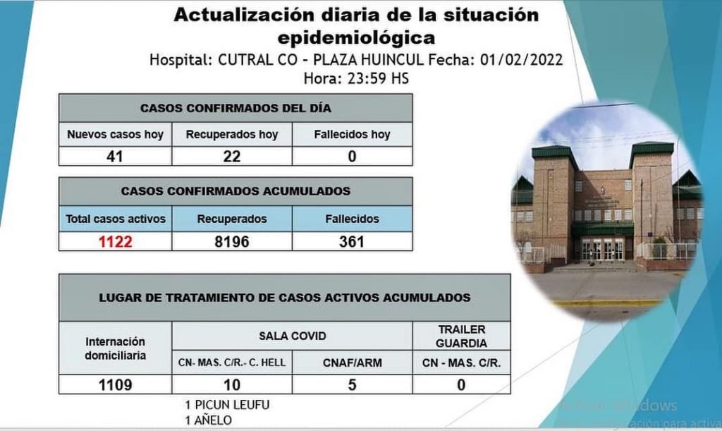 El parte epdidemilógico emitido desde el hospital Complejidad Media ,de este martes 1º de febrero, confirmó 41 nuevos casos, 22 recuperados y sin fallecidos.