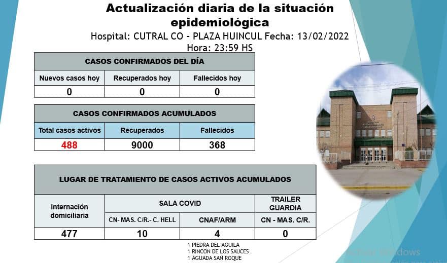 En sala covid continúan internados 14 pacientes, de los cuales cuatros se encuentran con Asistencia Mecánica Respiratoria; uno oriundo de Piedra de Águila, uno de Aguada San Roque, uno de Rincón de los Sauces y otro de la comarca. 477 transitan la enfermedad en sus domicilios.