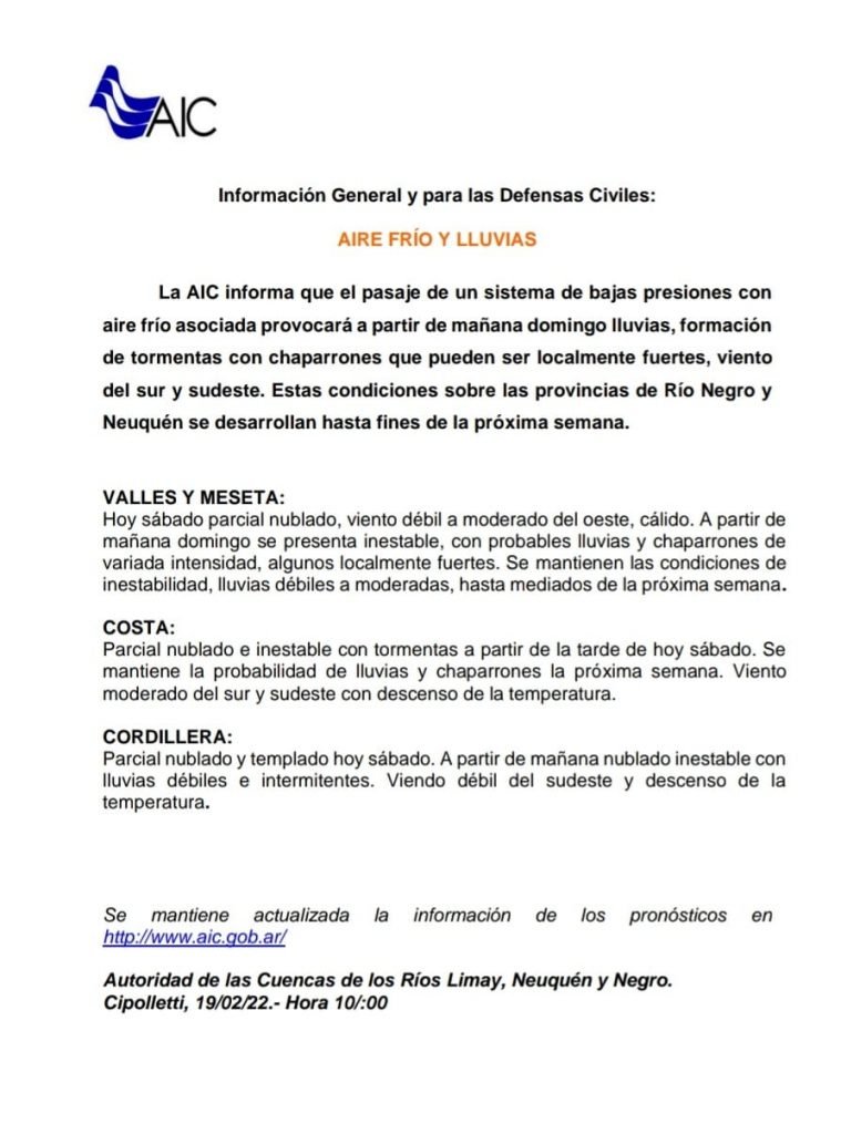 Desde la Autoridad Interjusdiccional de Cuencas se anunció para este domingo el pasaje de un sistema de bajas presiones aire frío que provocará a partir de mañana lluvias, formación de tormentas con chaparrones que pueden ser localmente fuertes, viento del sur y sudeste.