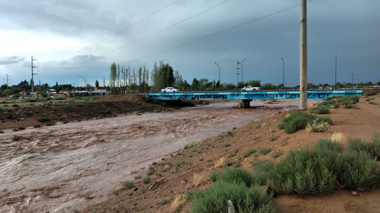 Tal como estaba anunciado, el pronóstico de fuertes lluvias e intensas tormentas en la zona hizo que esta tarde el zanjón colector de crecientes lleve un importante caudal.