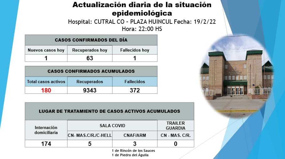 El hospital local también informó que hay 174 transitando la enfermedad en sus hogares. En cuanto a los pacientes internados, cinco se encuentran en la sala covid y tres en terapia intensiva con el requerimiento de la asistencia respiratoria mecánica. Se indicó además que hay un paciente oriundo de Rincón de los Sauces y otro de Piedra del Águila.