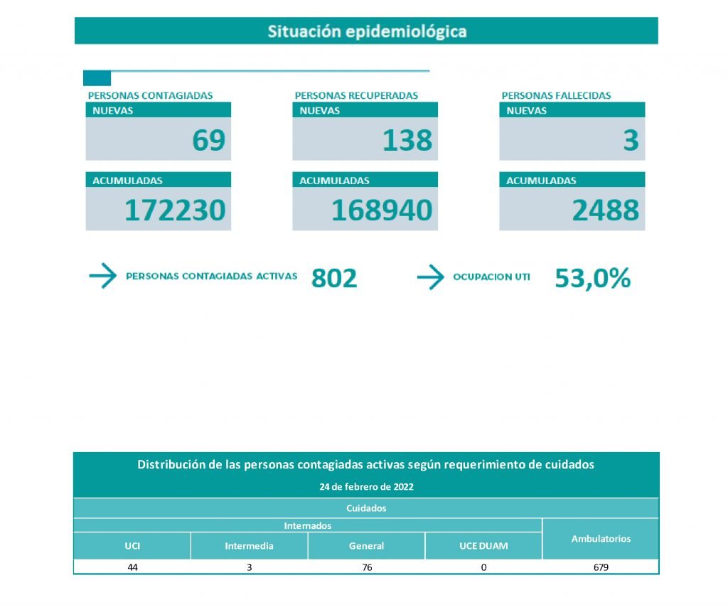 El comité de emergencias provincial informó que hubo 69 nuevos contagios en toda la provincia y que se recuperaron 138 personas.
