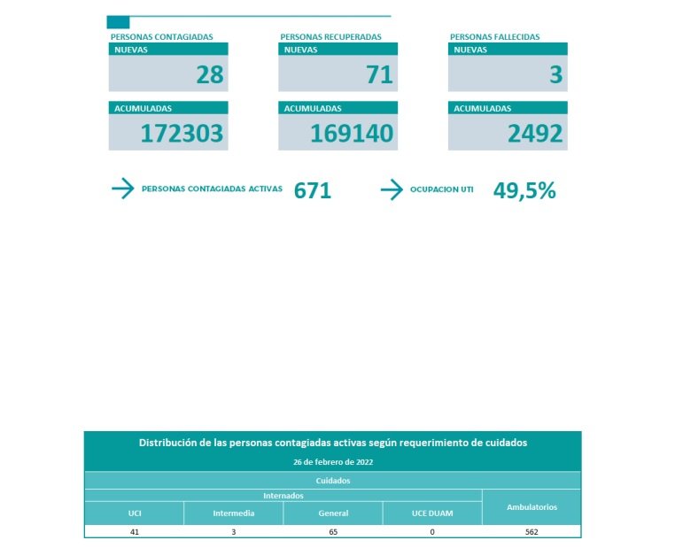 La ocupación de camas UTI sigue en disminución con el 49,5% y las personas activas contagiadas son 671.
