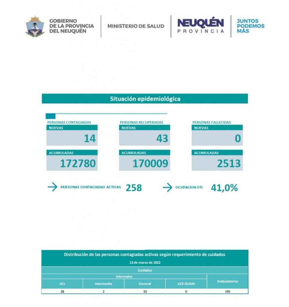Según los datos suministrados por el comité de emergencias provincial, en Neuquen no se registraron fallecidos, hubo 14 nuevos contagios y 43 recuperados.