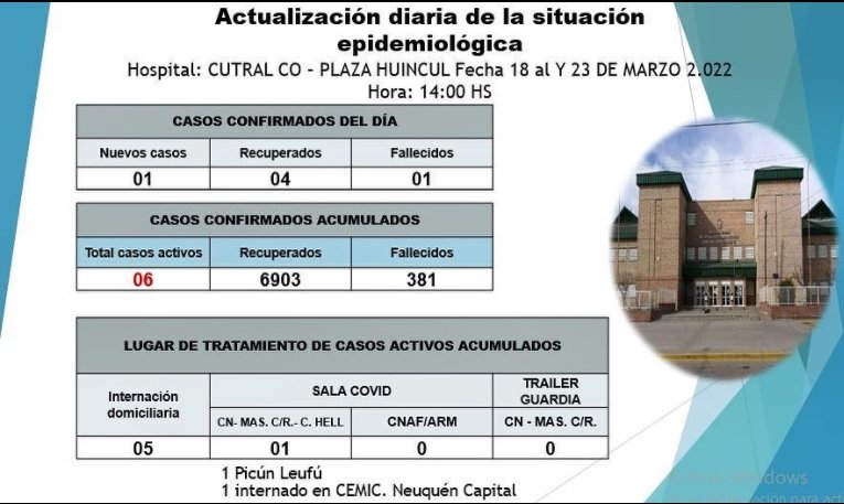 Se detalló que hay cinco pacientes que transitan la enfermedad en sus domicilios, y que hay una persona internada en sala Covid, sin requerimiento de asistencia respiratoria mecánica. Además hay un paciente de Picún Leufú y un paciente internado en el CMIC de Neuquén capital.