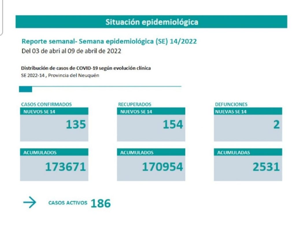 El último parte semanal (del 3 al 9 de abril) emitido por provincia confirmaron el fallecimiento de dos personas. Ademas se registraron 135 nuevos casos y 154 pacientes recuperados.