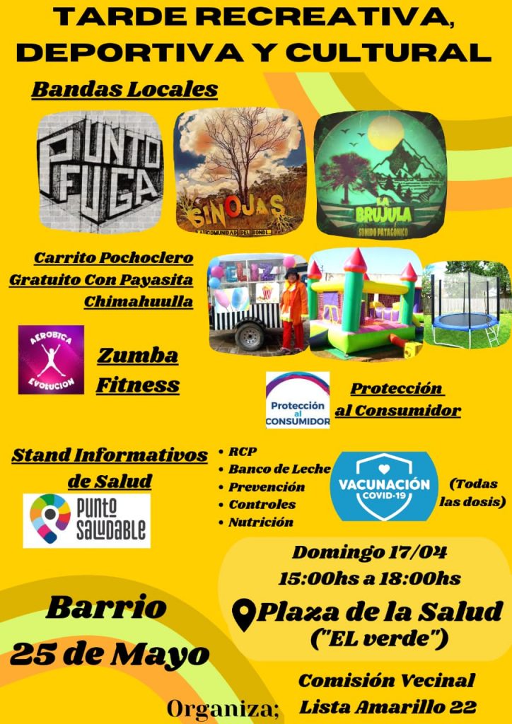 Para este domingo 17 de abril programaron actividades en la plaza “El Verde” para que los vecinos participen y conozcan las propuestas que tiene la lista Amarilla. La jornada comenzará a las 15 y contará con bandas locales stand informativo de salud, punto saludable, un rincón para los chicos, pelotero, cama elástica y actividades deportivas y culturales.