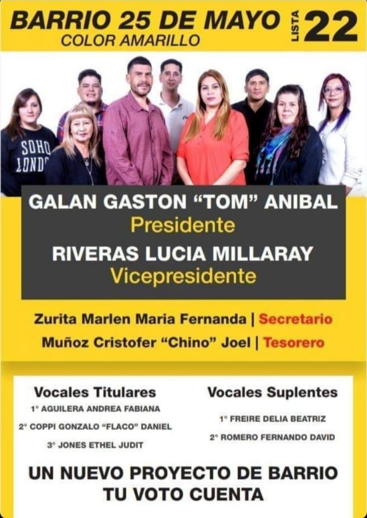 “Somos un grupo de vecinos que venimos trabajando hace tiempo en diferentes actividades y se dio la oportunidad de formar una lista y participar en estas elecciones.” comentó Gastón “Tom” Galan quien lidera la lista; y agregó “Mas allá de quien encabece. Lo mas preponderante e importante es la unión como grupo para llevar a cabo nuestras propuestas y proyectos”.