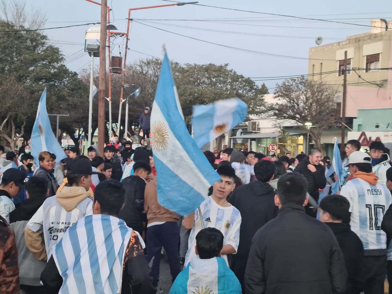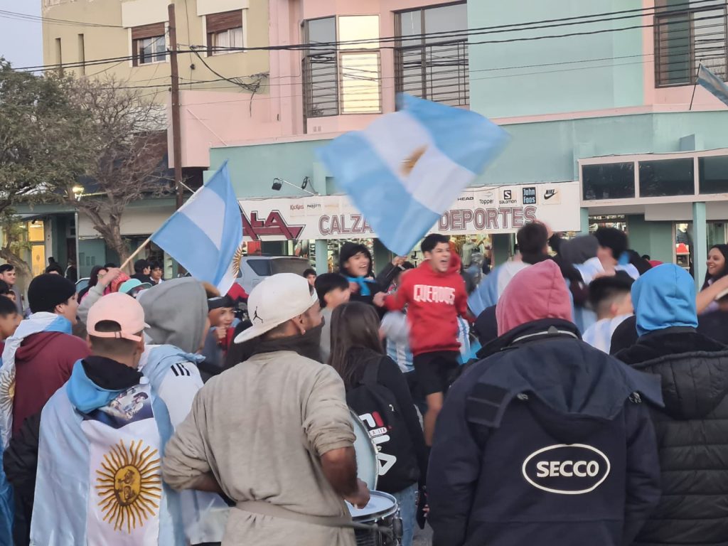 La selección argentina se convirtió en campeona de la Finalissima tras golear por 3 a 0 a sus pares italianos. De inmediato, los hinchas lucieron sus camisetas, gorros e hicieron flamear las banderas en el monolito fundacional de Cutral Co, en Carlos H. Rodríguez y avenida del Trabajo.