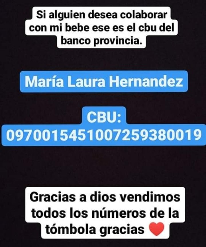 Los jóvenes padres explicaron que el dinero recaudado será utilizado en estadía y gastos de las operaciones. El CBU para hacer donaciones es del Banco Provincia de Neuquén: 0970015451007259380019.