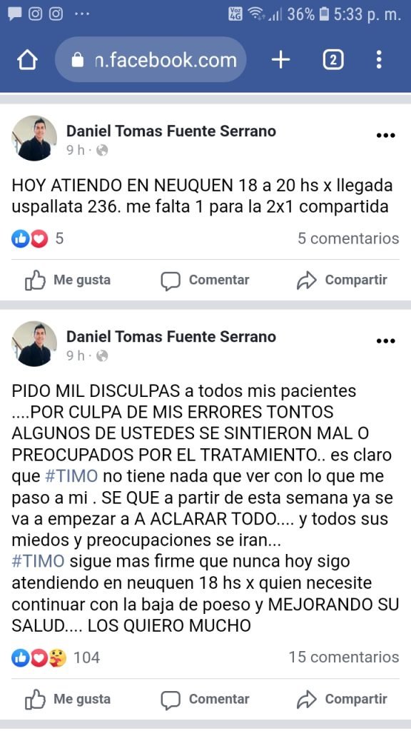 De manera insólita, porque el caso de la estafa alcanzó gran repercusión en la zona, y porque el controvertido médico ya tiene un largo historial de asuntos delictivos atados a su nombre, en las últimas horas en la página de Facebook Daniel Tomas Fuente Serrano (Cirugía Plástica Neuquén) se puede ver la convocatoria a concurrir al consultorio por orden de llegada, e incluso un posteo pidiendo disculpas por “mis errores tontos” a los seguidores del sistema TIMO, un método para bajar de peso que tiene muchos adeptos en la región.