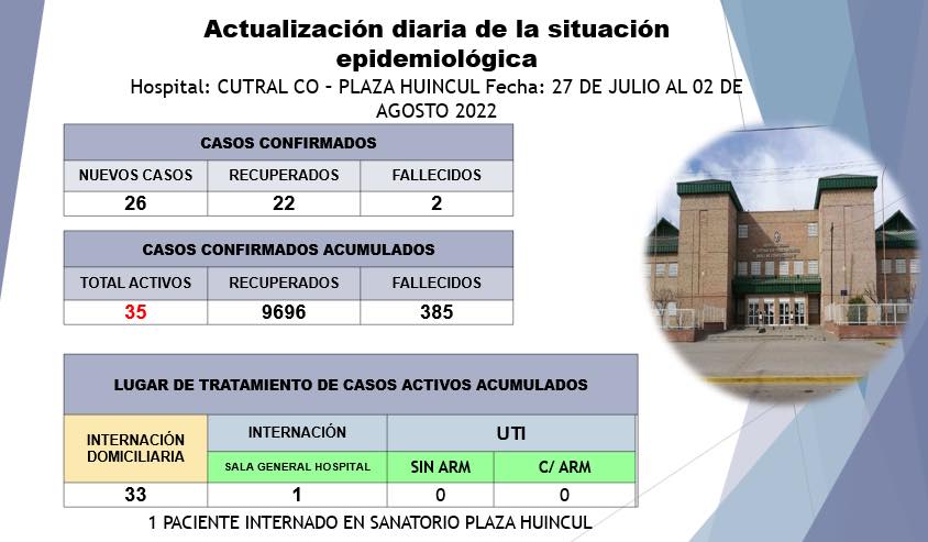 En el último parte emitido por el sector de epidemiología del hospital complejidad Media correspondiente a la semana del 27 de julio al 2 de agosto, informaron dos fallecidos, 26 nuevos contagios y 22 recuperados.