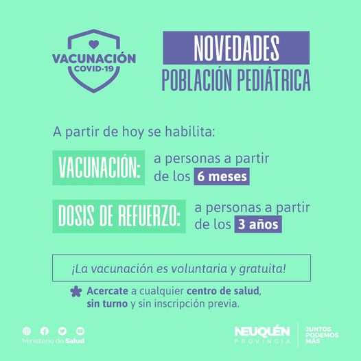 Desde hoy, queda habilitada la vacunación Covid-19 destinada a niñas y niños a partir de los seis meses y la aplicación de refuerzo a partir de los 3 años, según confirmó el ministerio de Salud de la provincia de Neuquén.