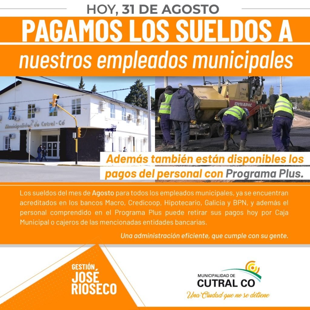 Este miércoles 31 de agosto están disponibles los haberes de los agentes municipales de Cutral Co, según se informó desde la comuna cutralquense.
