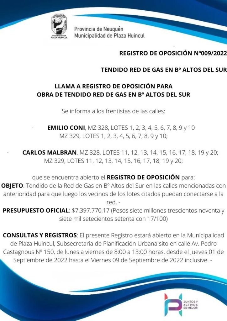 El municipio de Plaza Huincul comunicó que desde el 1 de septiembre y hasta el viernes 9 de septiembre quedará abierto el registro de oposición para la obra de gas en barrio Altos del Sur.