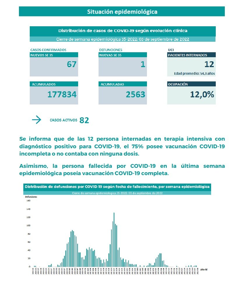 En cuanto a las personas internadas en la Unidad de Terapia Intensiva son 12 y el porcentaje de ocupación también es de 12%. Mientras que los casos activos son 82.