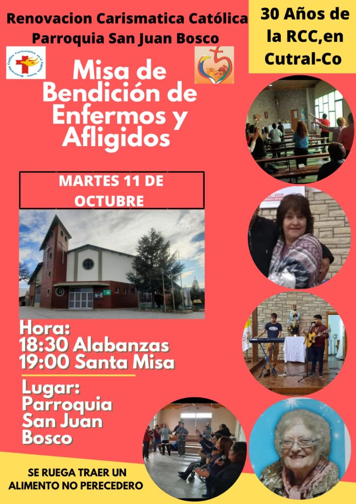 Este martes 11 habrá misa de bendición de enfermos y afligidos en la parroquia San Juan Bosco de Cutral Co. Desde la institución se pide a las y los fieles que concurran con un alimento no perecedero.