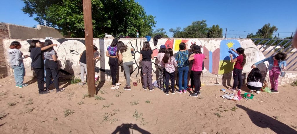 El día lunes iniciaron con la inauguración de un mural en la escuela 138 de Cutral Co donde trabajaron docentes y estudiantes gracias a a colaboración de una vecina quien donó las pinturas para poder realizar la obra.