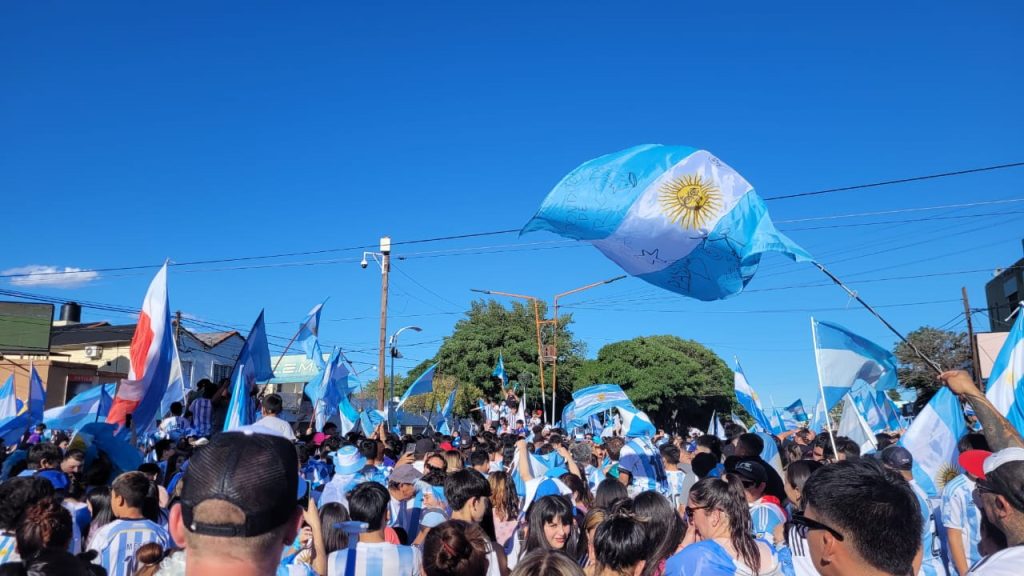 A las improvisadas caravanas hacia la zona céntrica le siguió la concentración en el monolito fundacional -en avenida Carlos H Rodríguez y del Trabajo- donde todo fue celeste y blanco.