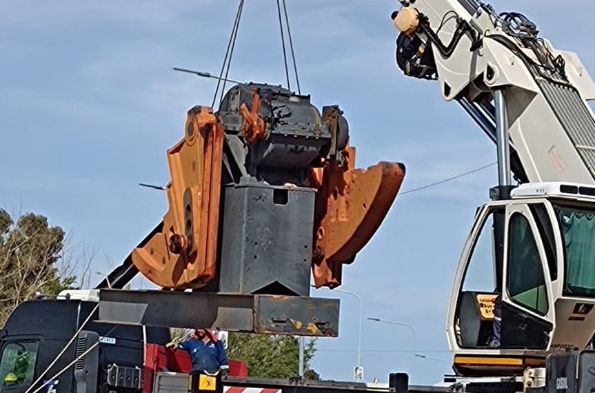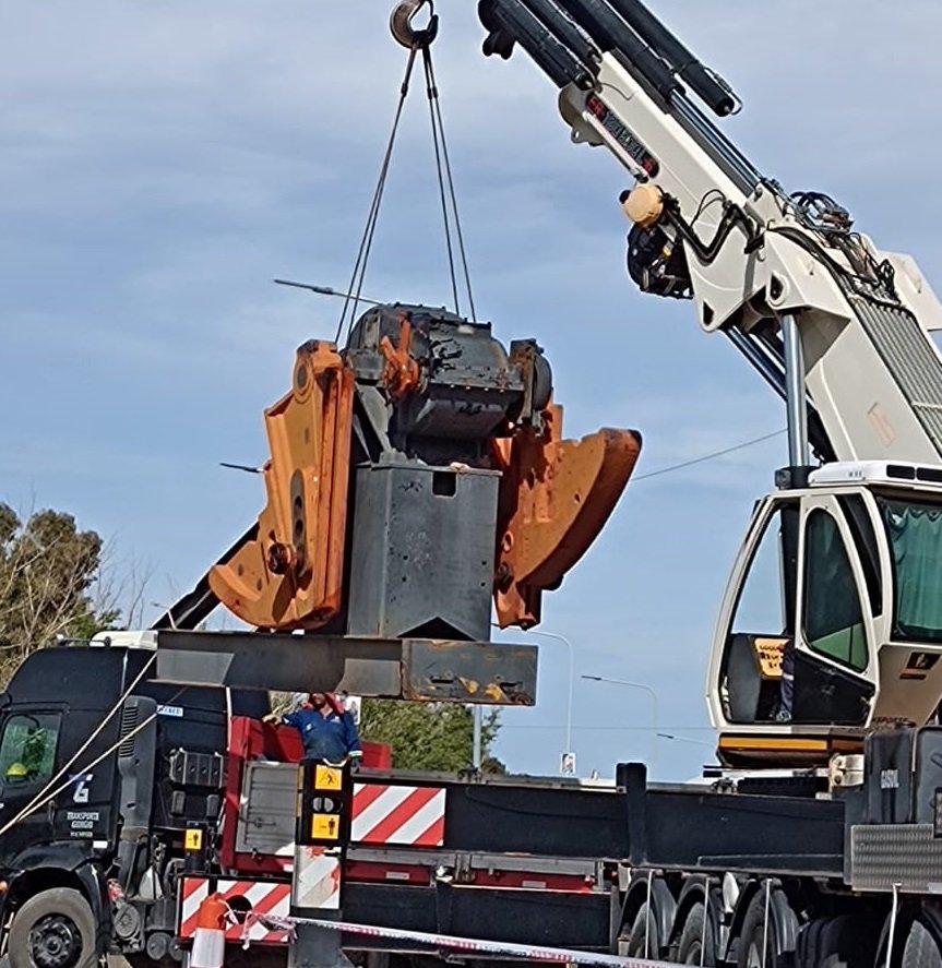 La pesada pieza cayó sobre la mano de acceso a la vía nacional desde la calle 9 de Julio en Plaza Huincul. El vehículo pesado transitaba desde el oeste a este y al atravesar la rotonda que está en el límite entre ambas ciudades, y retomar la Ruta 22, por razones que se desconocen se cayó sobre el pavimento.
