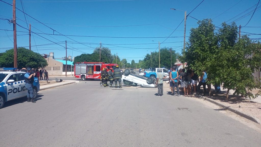 El incidente vial fue poco antes de las 11 de la mañana y se supo que el conductor tiene alrededor de 21 años. En principio se supo que el auto se desplazaba por 13 de Diciembre en el sentido sur – norte y al intentar girar hacia Sarmiento, el conductor no le calculó bien y tragó el cordón por lo que se produjo el vuelco.
