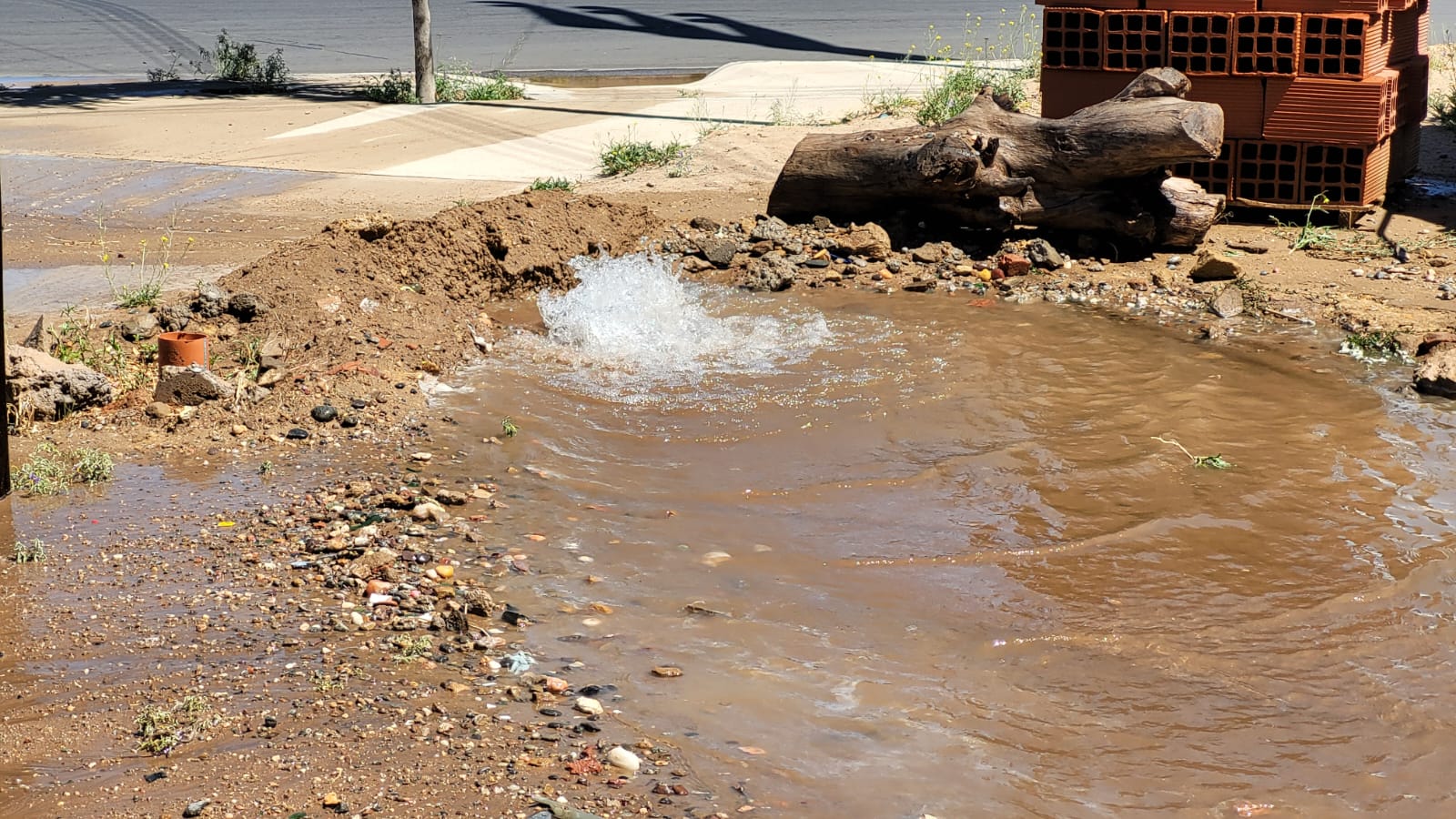 Este mediodía se registró la rotura de un caño de la red de agua en el barrio Pampa de Cutral Co. Una máquina vial que trabajaba en una vereda fue la que ocasionó el enganche y posterior daño.
