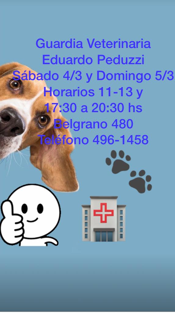 Durante este fin de semana habrá una guardia veterinaria que, en este caso es la de Eduardo Peduzzi, Funcionará el sábado 4 y el domingo 5 de 11 a 13. Mientras que por la tarde, de 17:30 a 20:30.
