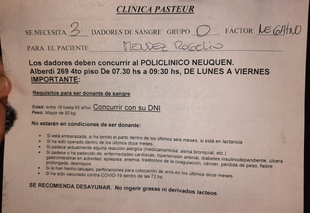 El vecino de Cutral Co, Rogelio Méndez se encuentra internado en la clínica Pasteur y solicitan la donación de tres dadores del factor O negativo.