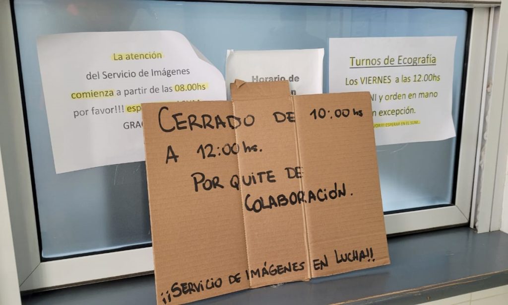 El servicio de Imágenes del hospital de Complejidad Media hoy realizan un quite de colaboración. La medida de fuerza la llevan adelante porque el tomógrafo está roto y los equipos de rayos les falta mantenimiento, entre otras cosas.