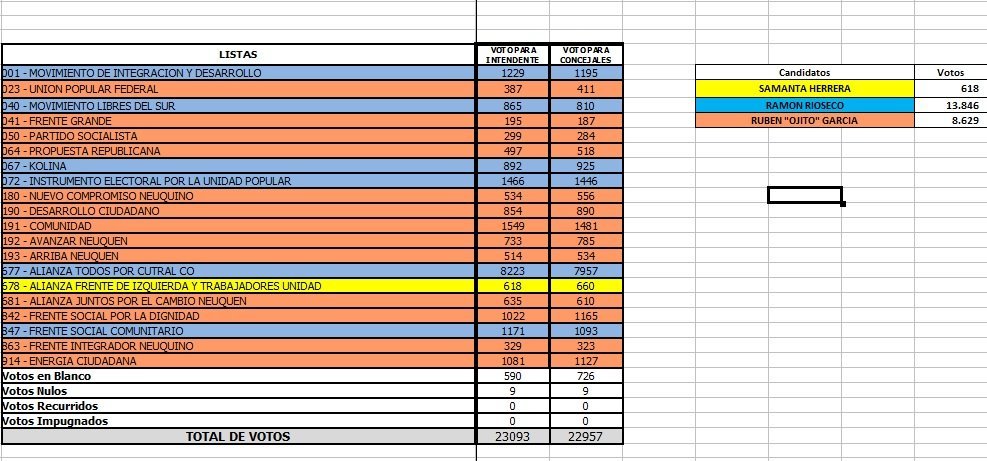 Esta tarde concluyó el escrutinio definitivo que había comenzado a las 17 en la sede de la Junta Electoral Municipal de Cutral Co. El resultado fue el siguiente: 13.846 votos para Ramón Rioseco, alianza Todos por Cutral Co; 8.629 para Rubén “Ojito” García por Comunidad; y 618 para Samanta Herrera de Frente de Izquierda y Trabajadores Unidad.