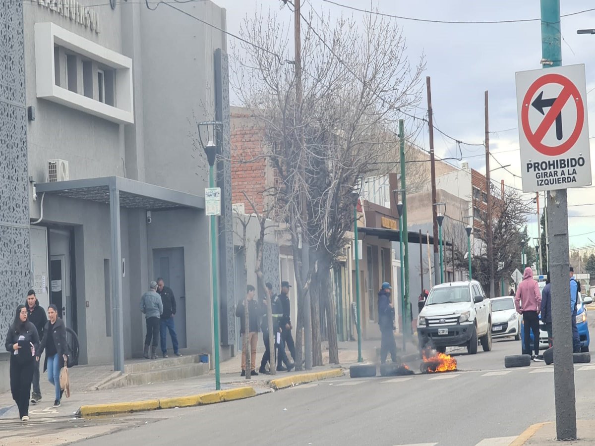 Un grupo de personas realiza una protesta frente al edificio municipal de Plaza Huincul, sobre la avenida san Martín -Ruta 22- sobre la mano sur.
