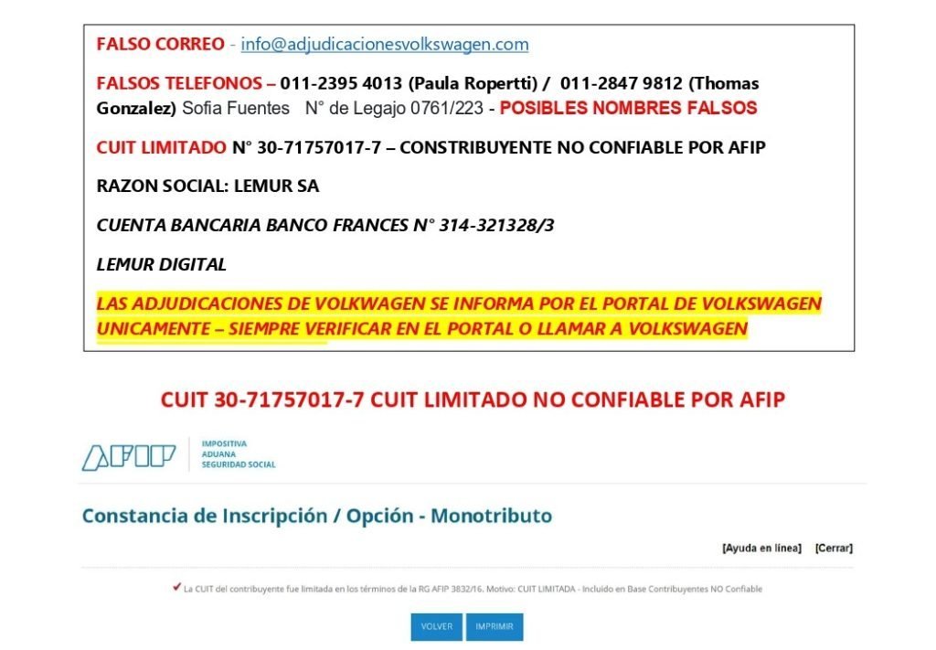 Además, es importante tener en cuenta que se han identificado datos falsos asociados con la estafa, como la dirección de correo electrónico “info@adjudicacionesvolkswagen.com” y los números de teléfono con características de Buenos Aires, a nombre de “Paula Ropertti” y “Thomas González”.