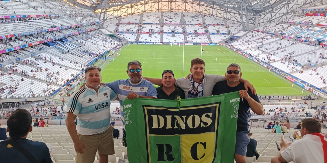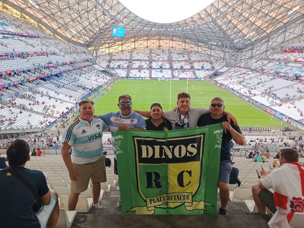 Silvio Saavedra, Javier Pino, Gabriel Brizuela, Daniel Maciel y Maxi Lozano, jugadores de Dinos Rugby Club, se unieron a un nutrido grupo de aficionados a este deporte de la ciudad de Centenario, para viajar por Europa, con la premisa de alentar a la selección nacional en su debut en el mundial ante Inglaterra, que se disputó en Marsella.