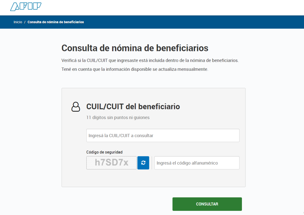 Sólo tenés que escribir tu CUIL o CUIT, ingresar un código de seguridad, y dar click en “consultar”.