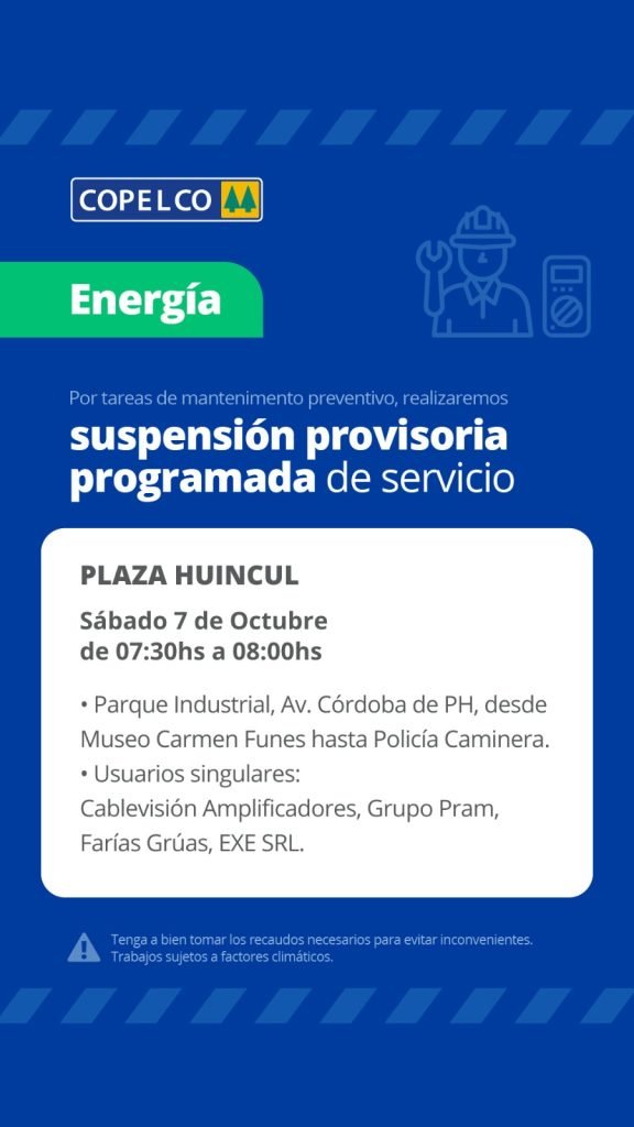Este sábado, desde las 7:30 y hasta las 8 habrá un corte de energía anunciado por la cooperativa Copelco y que afectará a un sector de Plaza Huincul.