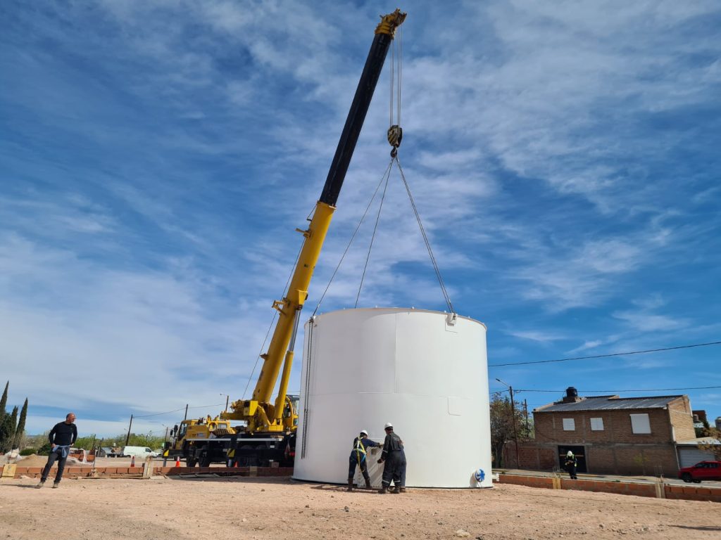 Antes del mediodía quedó instalado el tanque que permitirá el rebombeo de agua y aumentar la presión para las 176 Viviendas, uno de los sectores más críticos para que llegue el líquido a los hogares, en este sector de Cutral Co.