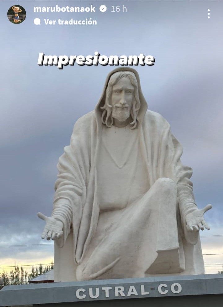 En sus redes sociales, Maru Botana compartió su admiración por la escultura del Cristo de Cutral Co, acompañando una fotografía de la majestuosa obra de arte con la palabra “Impresionante”. La publicación en sus historias de Instagram captó la atención de sus seguidores, quienes también expresaron su asombro ante la imponente escultura que adorna la región.