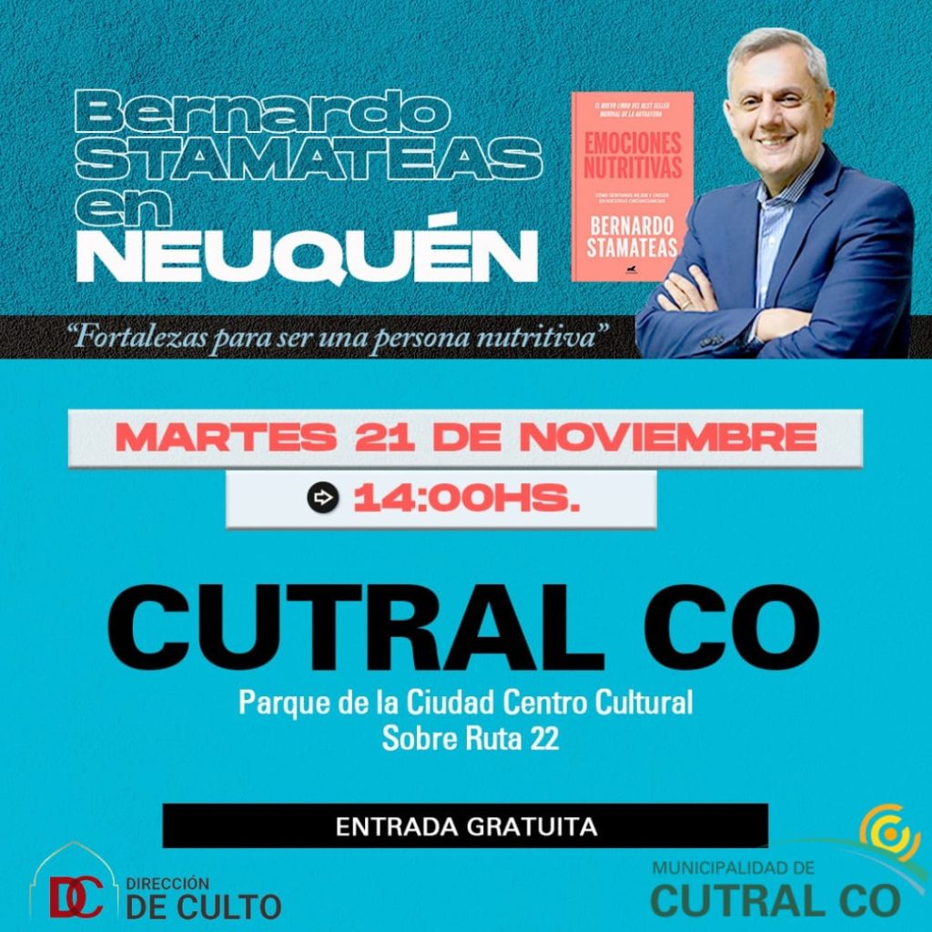La charla de Bernando Stamateas que se llevará adelante el próximo martes 21, en el Centro Cultural de Cutral Co tiene acceso gratuito. Sin embargo, para garantizar los lugares que son 800, se debe retirar las entradas con anterioridad.