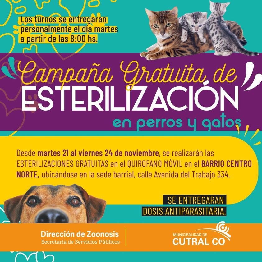 La dirección de Zoonosis de la municipalidad de Cutral Co anunció una nueva campaña de esterilización gratuita y entrega de dosis antiparasitaria en el barrio Centro Norte.