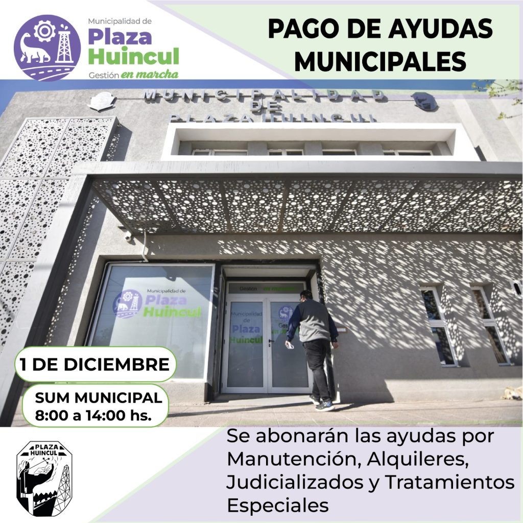 La municipalidad de Plaza Huincul anunció la acreditación de pagos de ayudas municipales que beneficiarán a un grupo de vecinos este viernes 1 de diciembre. El proceso se llevará a cabo en el Salón de Usos Múltiples (SUM) municipal y está diseñado para brindar apoyo a aquellos que requieren asistencia en alquileres, tratamientos especiales, manutenciones y casos judicializados.