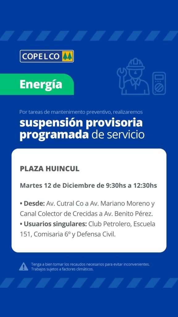 Se verán afectados los usuarios comprendidos entre avenida Cutral Co hasta Mariano Moreno; y desde el canal colector de crecidas hasta avenida Benito Pérez.