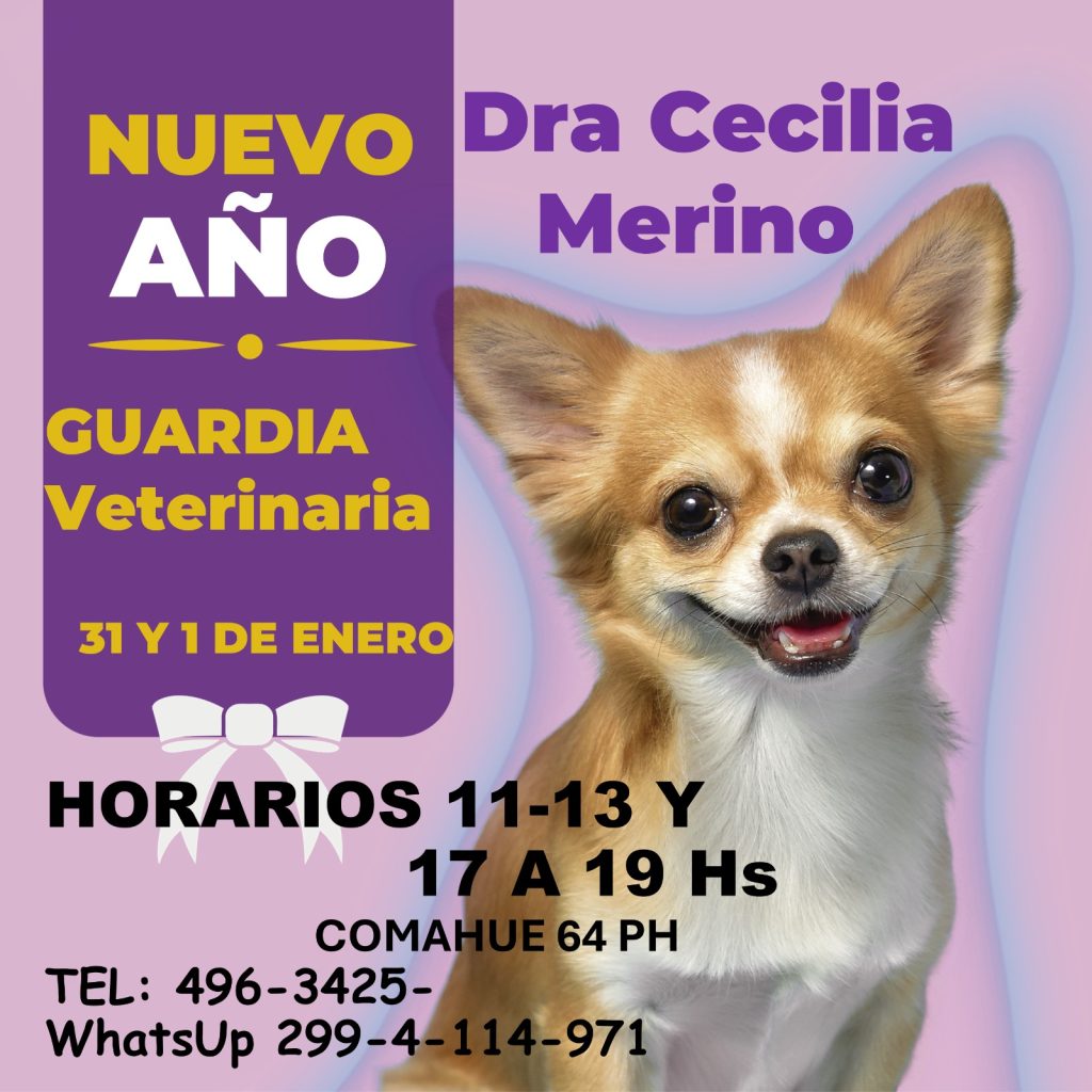 La veterinaria de guardia para este fin de año -domingo 31 y lunes 1 de enero de 2024- estará la veterinaria Cecilia Merino.