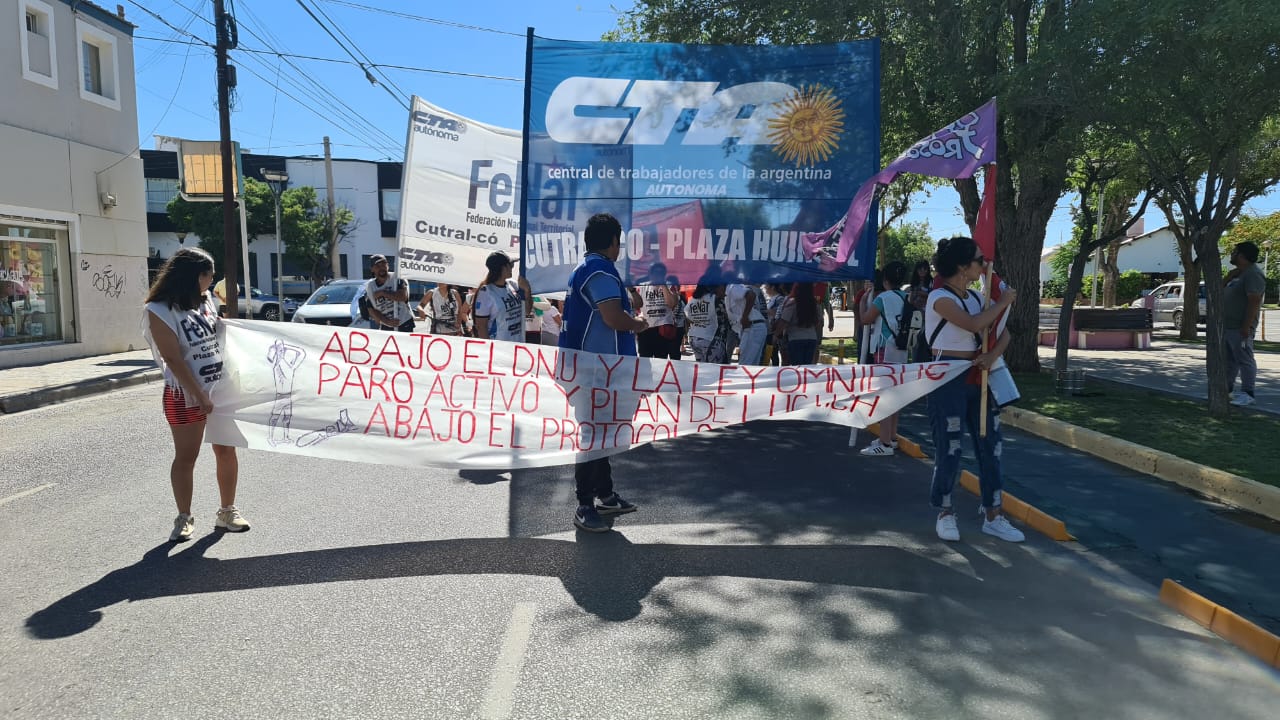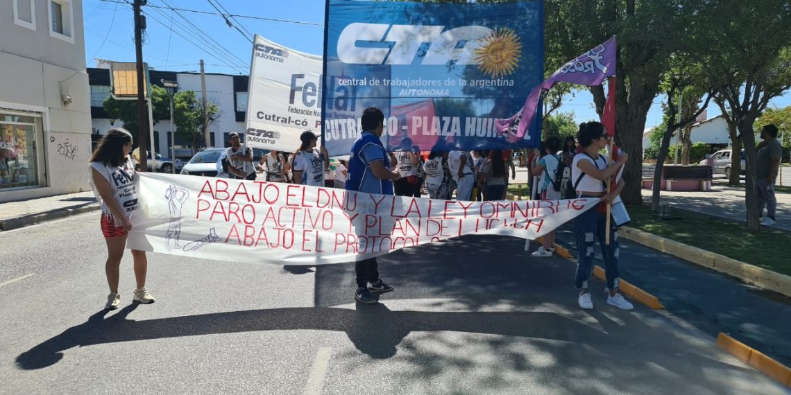 Organizaciones sociales y trabajadores adheridos a distintos gremios, se movilizan por distintas arterias céntricas de Cutral Co, en coincidencia con el paro general dispuesto por la Confederación General del Trabajo (CGT), en rechazo al DNU (decreto de necesidad y urgencia) nacional impulsado por el gobierno nacional.