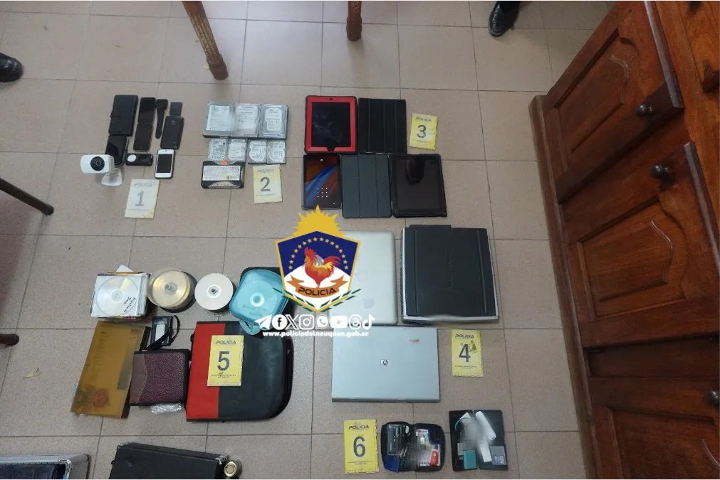 Los uniformados ingresaron a la casa y secuestraron una gran cantidad de teléfonos celulares, tablets, cámara digital, una notebook, elementos de almacenamiento informático, dos armas de fuego, calibre 22 y más de 200 municiones de diversos calibres.