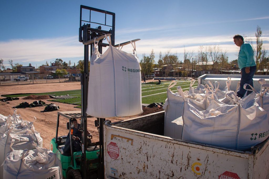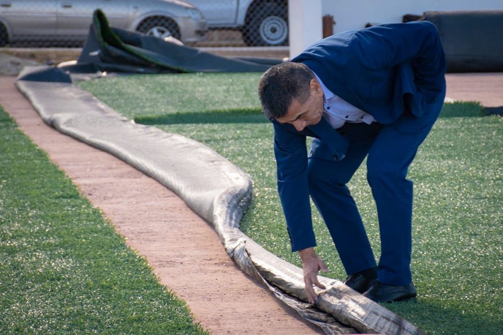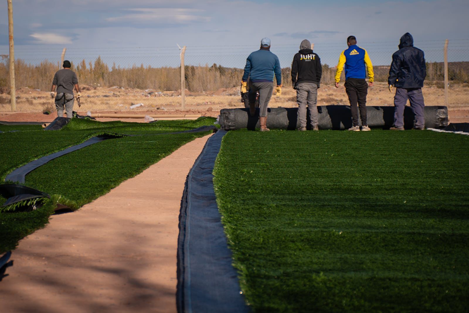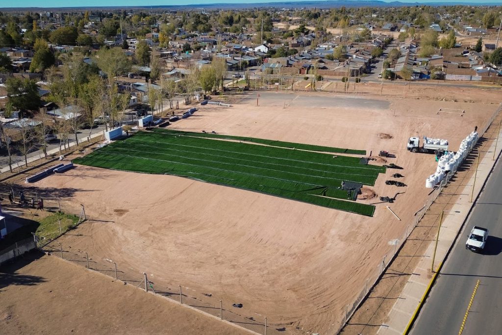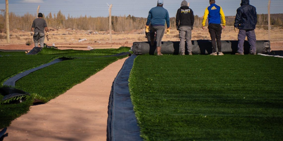 Luego de que se nivelara todo el terreno y también cercado con alambrado, en la jornada de ayer comenzaron a colocarse los primeros rollos de césped artificial y el intendente estuvo presente.