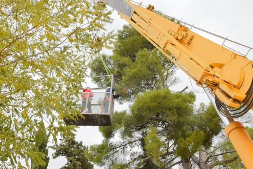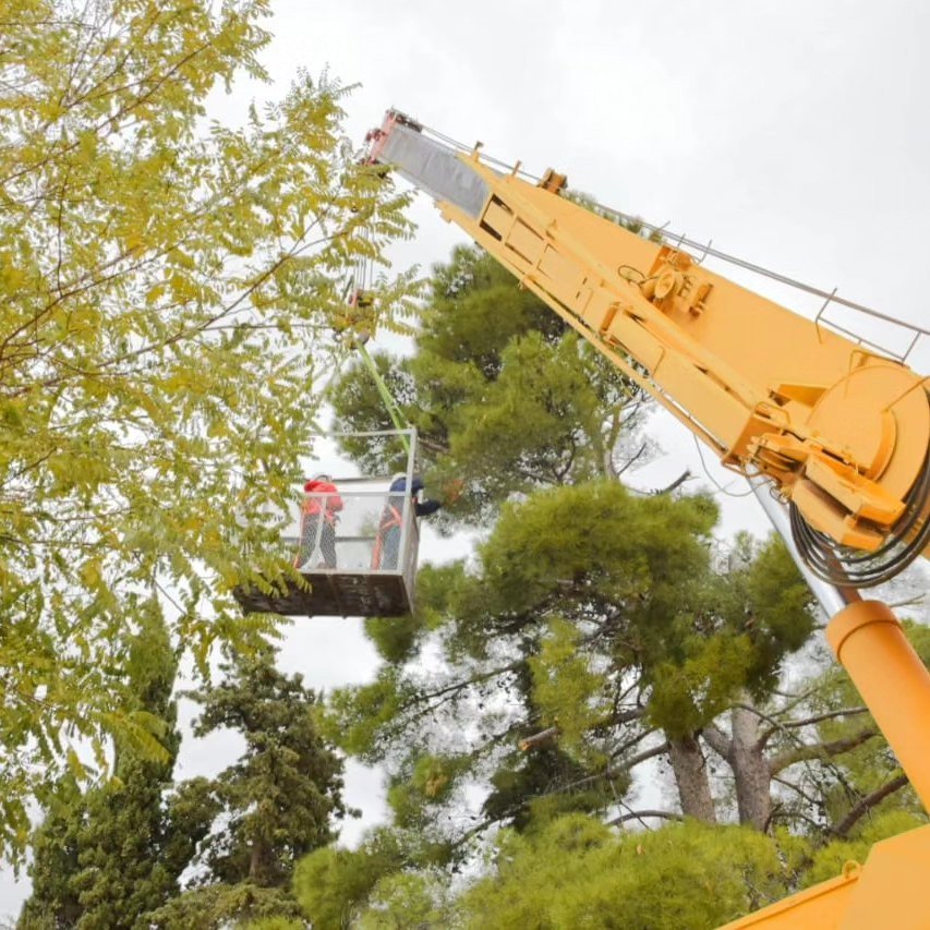 En la plaza Eva Perón de Central se cortaron ramas peligrosas de pinos, que son añejos y muy altos por lo que se requirió el uso de una grúa y elementos de seguridad.