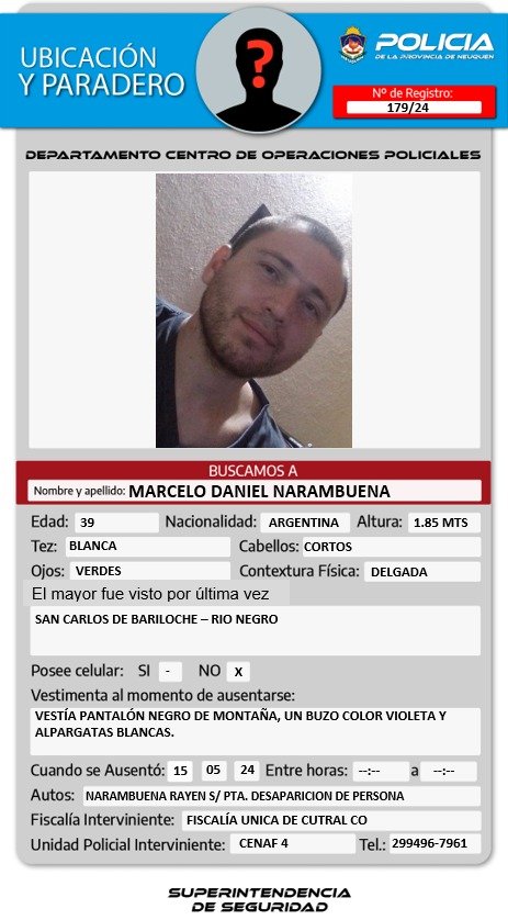 Un hombre de 39 años, identificado como Marcelo Daniel Narambuena es buscado desde Cutral Co, donde se radicó la denuncia. La última vez que se tuvo contacto fue en San Carlos de Bariloche, el pasado miércoles. La fiscalía única de Cutral Co intervino en la búsqueda.