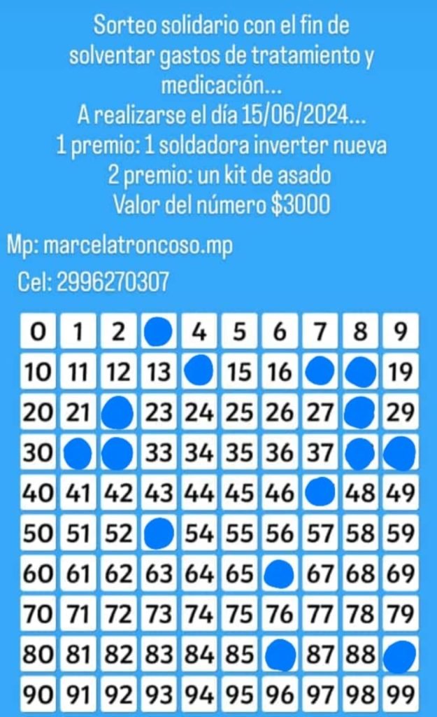 Para adquirir los números y contribuir a esta noble causa, los interesados pueden comunicarse al número de teléfono 2996270307 y realizar el pago a través de la cuenta de Mercado Pago marcelatroncoso.mp.