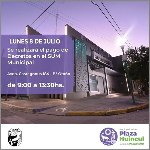 La secretaría de Hacienda de la municipalidad de Plaza Huincul informa a la comunidad que el próximo lunes 8 de julio se realizará el abono de decretos municipales en el Salón de Usos Múltiples (SUM) municipal. El SUM se encuentra ubicado en Avenida Castagnous 184, barrio Otaño, y estará abierto en horario continuo de 9:00 a 13:30 hs.